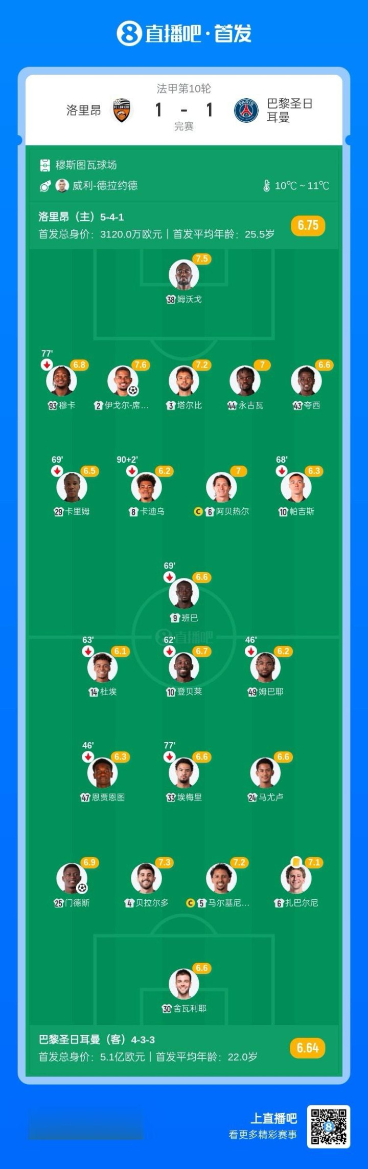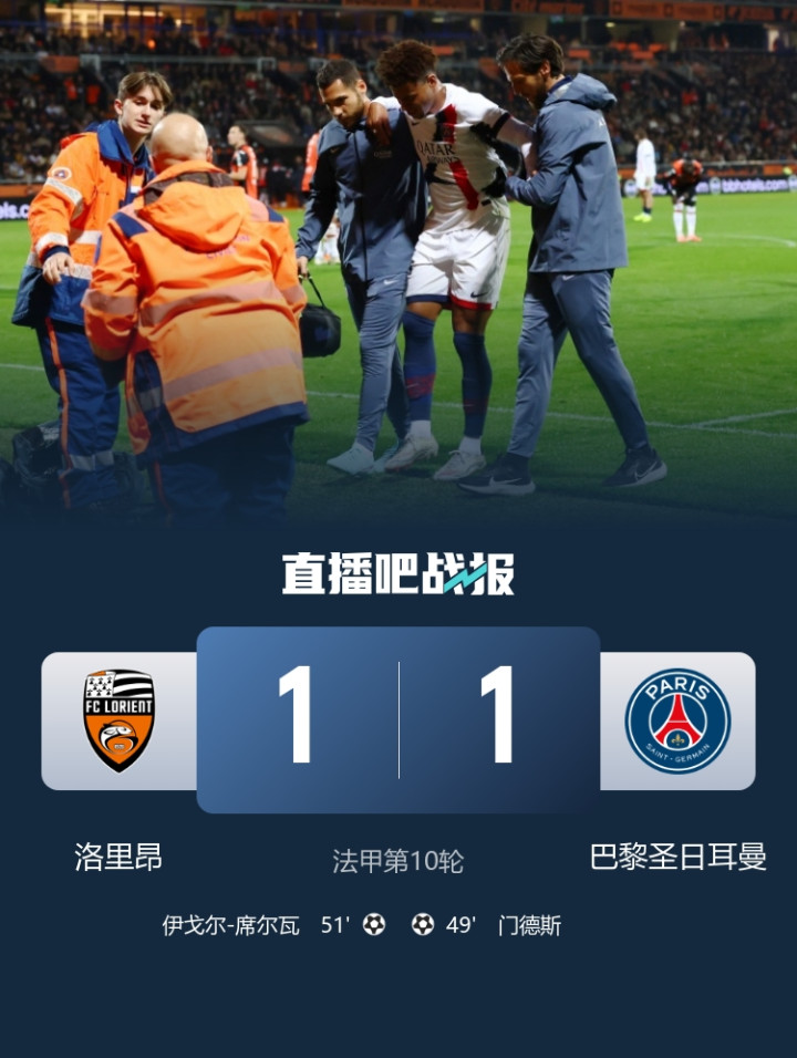 直播吧10月30日讯北京时间10月30日凌晨2时整,2025-26赛季法甲第10轮在勒穆托尔球场展开角逐,巴黎圣日耳曼客场对阵洛里昂。上半场巴黎3射门2射正未果,下半场门德斯打破僵局,伊戈尔-席尔瓦闪电扳平,杜埃伤退。最终巴黎圣日耳曼客场1-1战平洛里昂,积分榜方面,巴黎近4轮遭遇3平+仅1场零封,先赛积21分继续领跑。